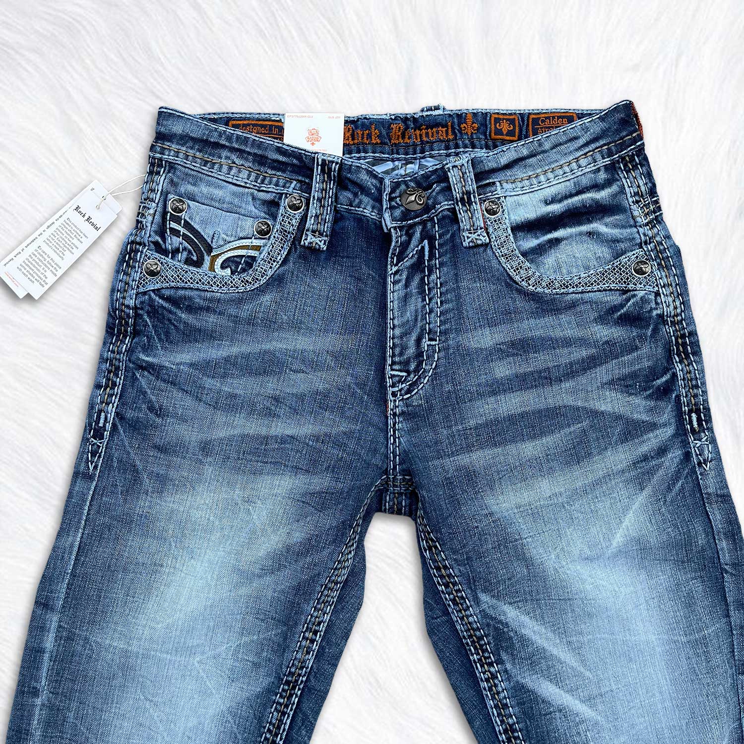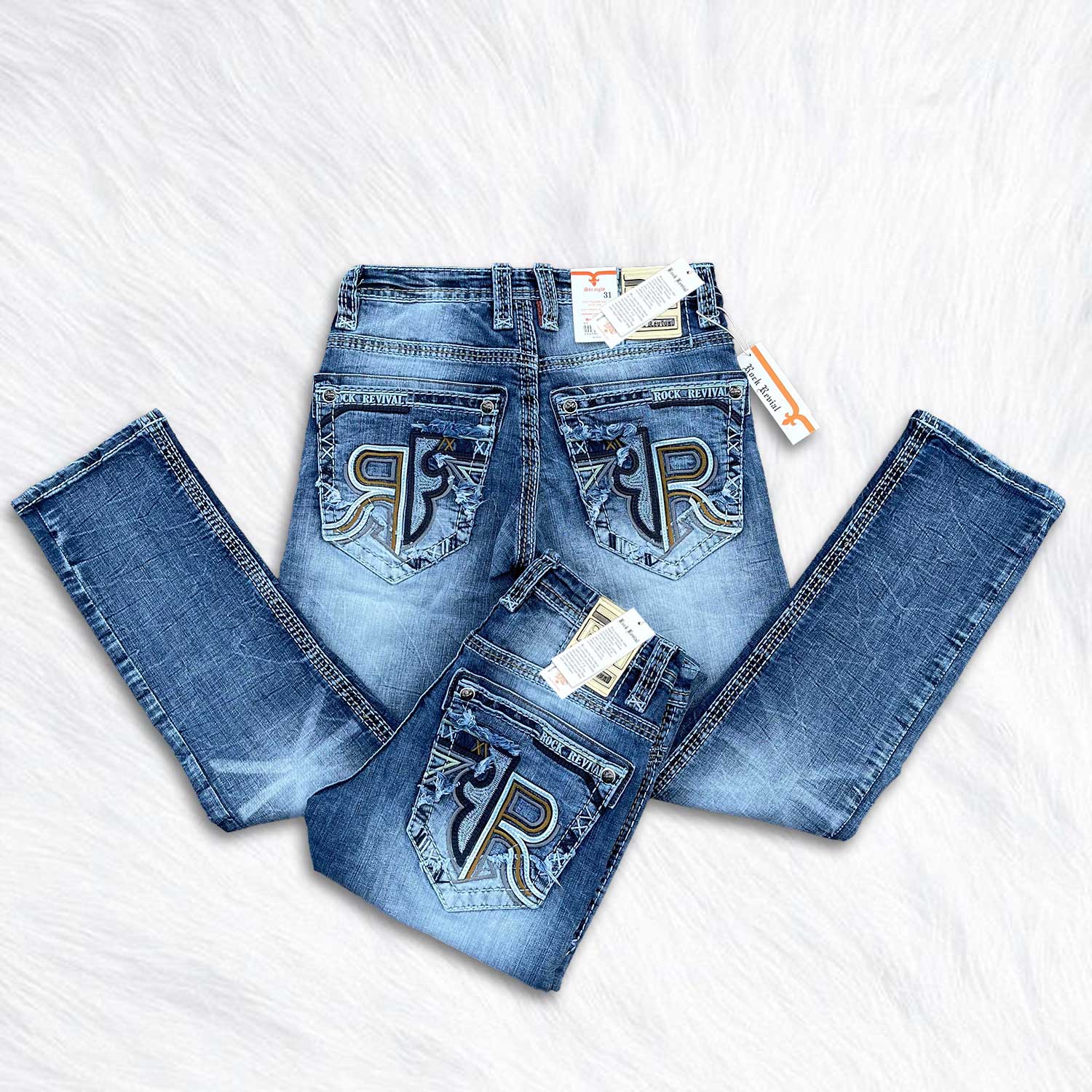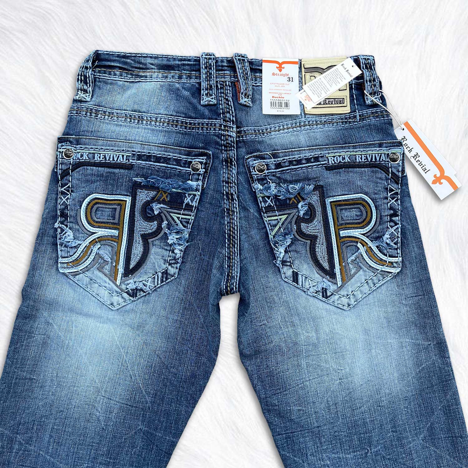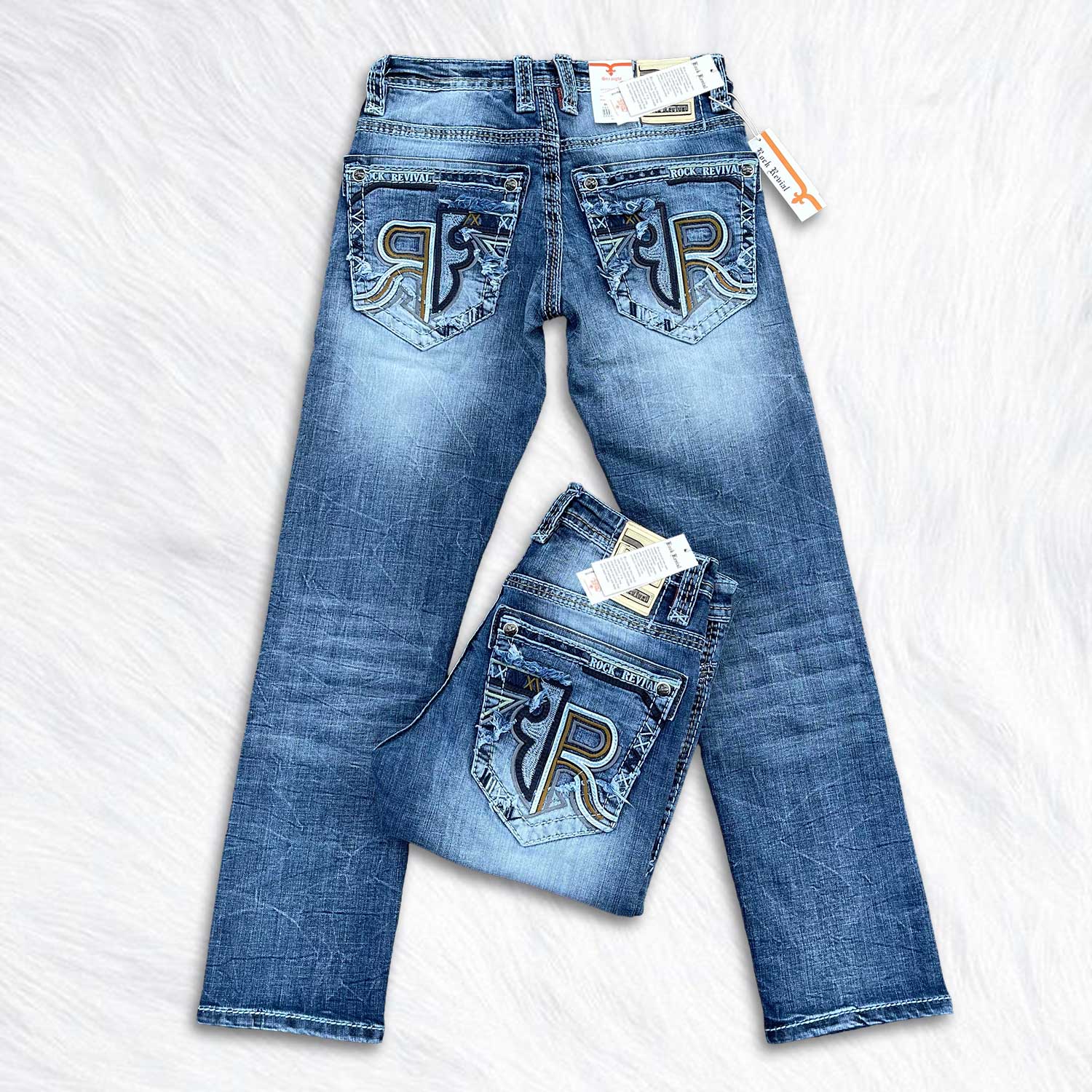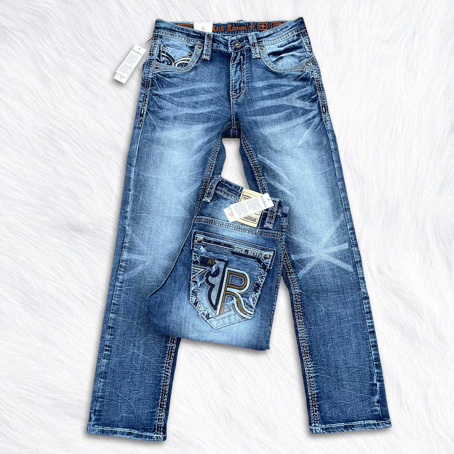 rock revival biker jeans for men – light blue straight leg denim with bold embroidered r pockets – western cowboy rider style