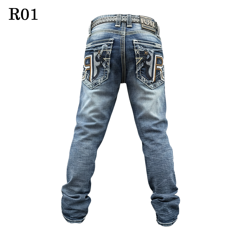 Jeans for Men – Light Blue Straight Leg Denim with Bold Embroidered R Pockets – Western Cowboy Rider Style R1