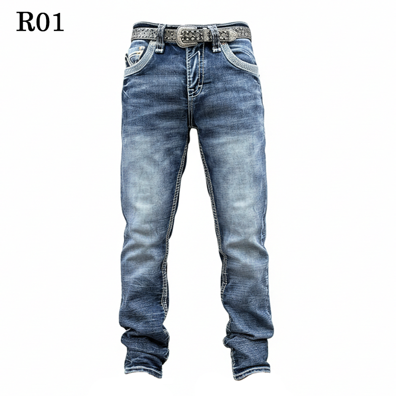jeans for men – light blue straight leg denim with bold embroidered r pockets – western cowboy rider style r1Jeans for Men – Light Blue Straight Leg Denim with Bold Embroidered R Pockets – Western Cowboy Rider Style R1